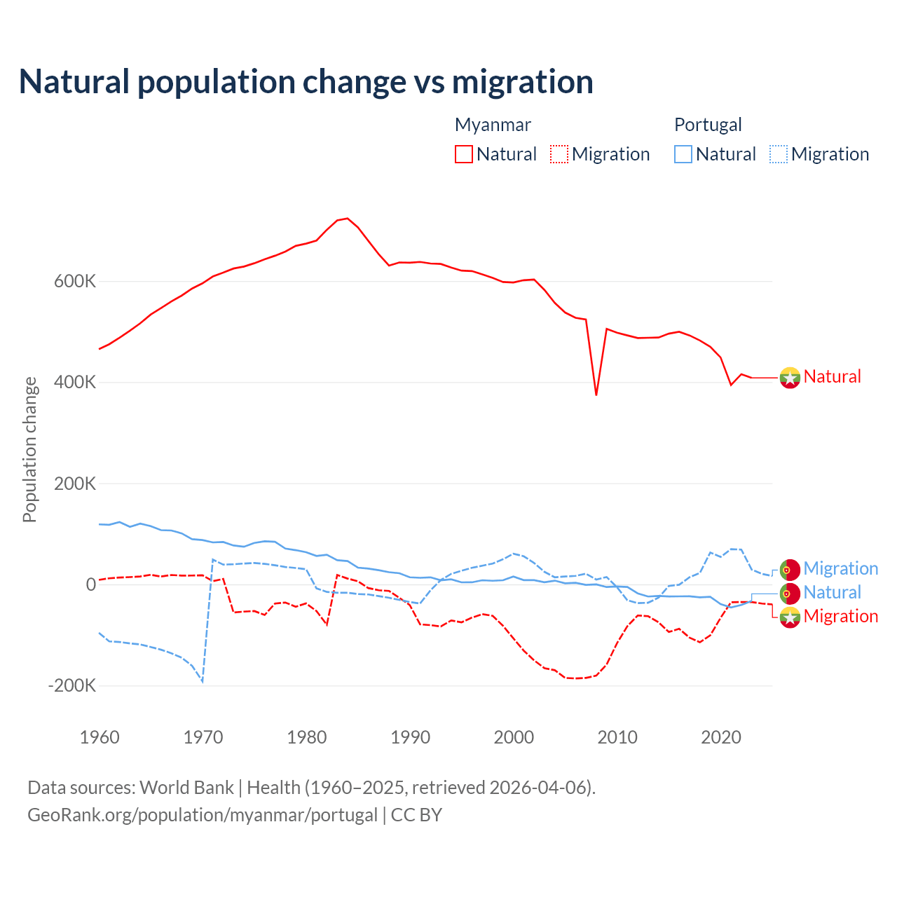 Over the last 10 years, 86% of the population change in Myanmar is from natural causes (a gain of 4,594,615 people) and 14% is from migration (a loss of 749,272 people). In Portugal 51% is from natural causes (a loss of 302,748 people) and 49% is from migration (a gain of 290,554 people).