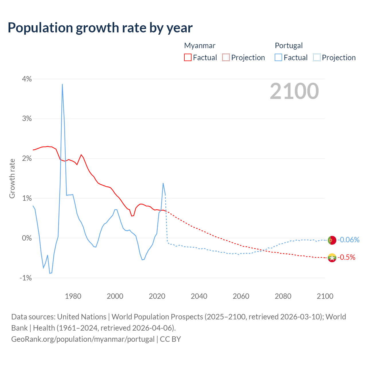 - For the last 10 years, Myanmar has had an average growth rate of +0.74% per year vs +0.21% in Portugal.