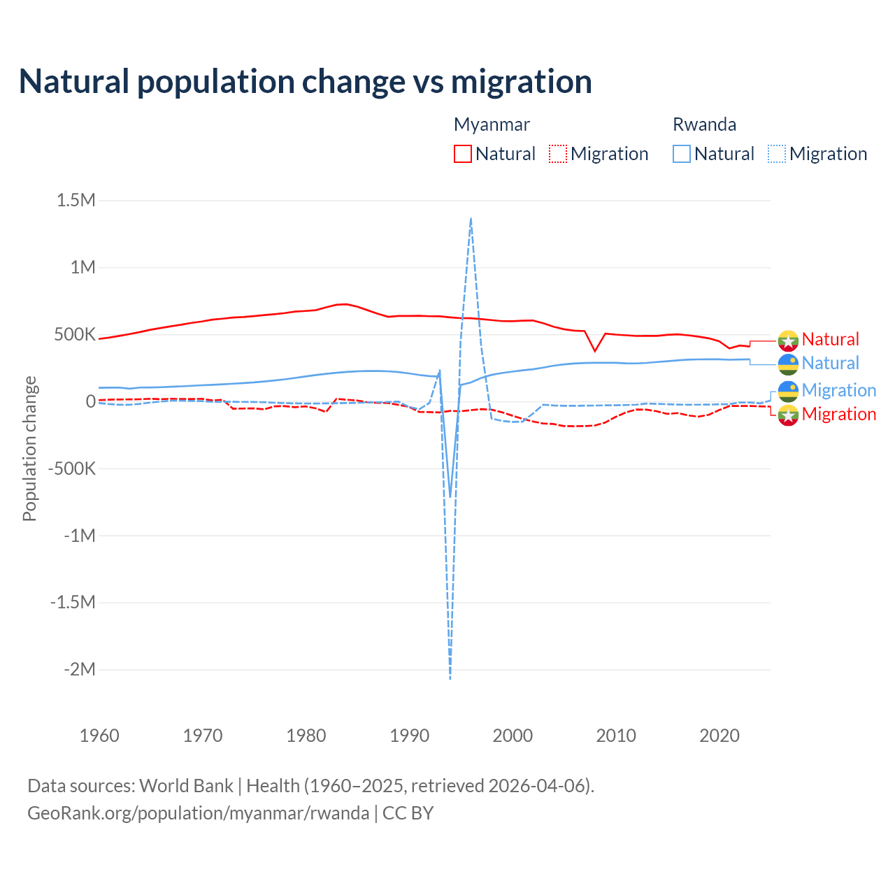 Over the last 10 years, 86% of the population change in Myanmar is from natural causes (a gain of 4,594,615 people) and 14% is from migration (a loss of 749,272 people). In Rwanda 93.8% is from natural causes (a gain of 3,081,296 people) and 6.18% is from migration (a loss of 203,035 people).