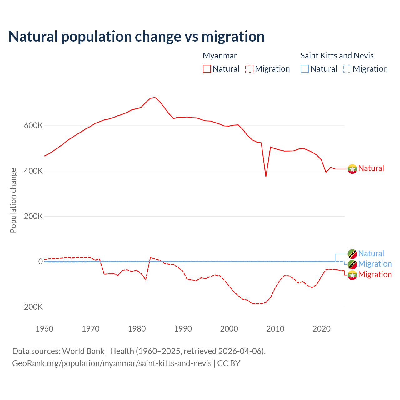 Over the last 10 years, 86% of the population change in Myanmar is from natural causes (a gain of 4,594,615 people) and 14% is from migration (a loss of 749,272 people). In Saint Kitts and Nevis 44.9% is from natural causes (a gain of 1,225 people) and 55.1% is from migration (a loss of 1,506 people).