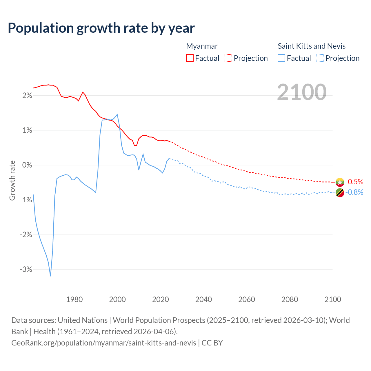 - For the last 10 years, Myanmar has had an average growth rate of +0.74% per year vs -0.04% in Saint Kitts and Nevis.