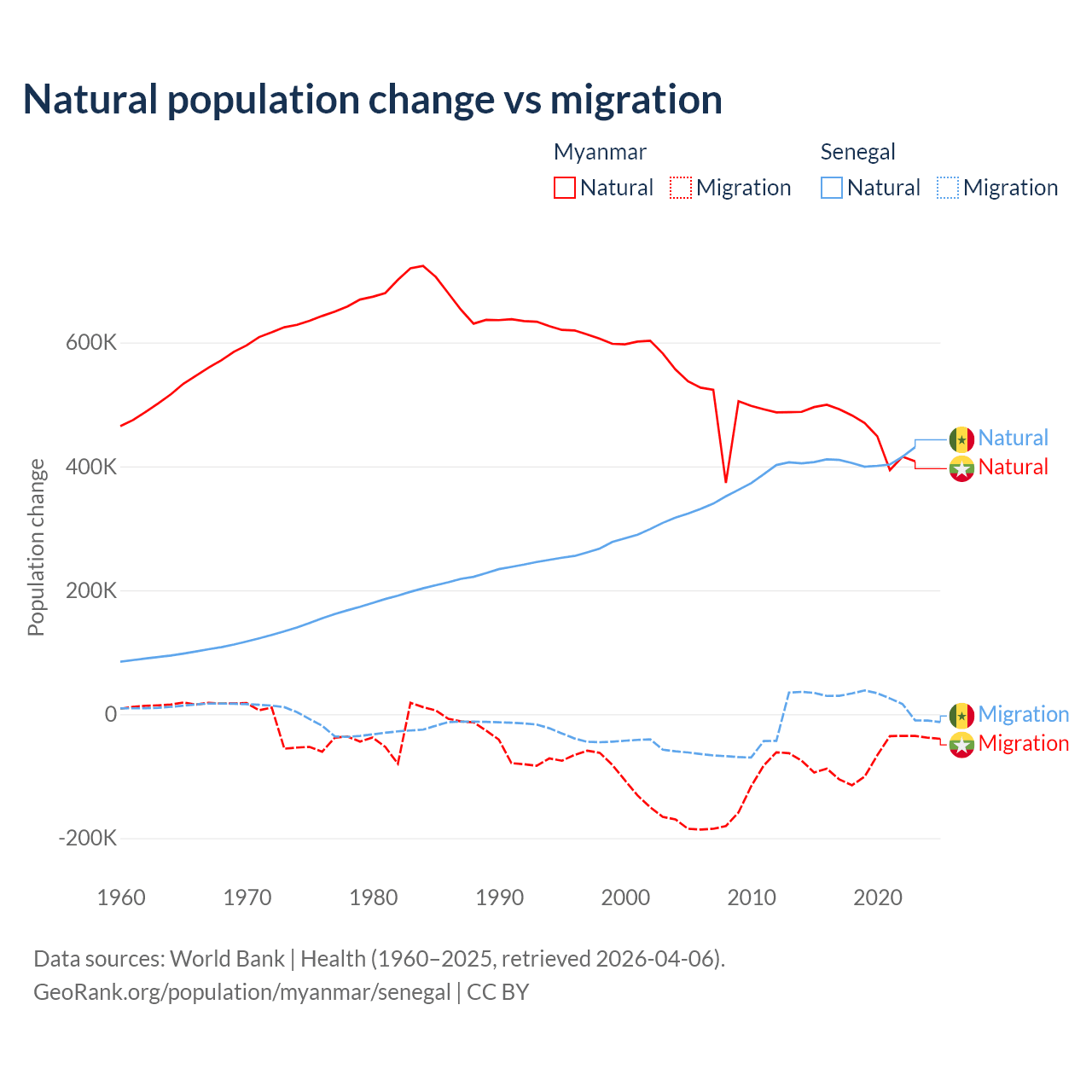Over the last 10 years, 86% of the population change in Myanmar is from natural causes (a gain of 4,594,615 people) and 14% is from migration (a loss of 749,272 people). In Senegal 93.9% is from natural causes (a gain of 4,089,205 people) and 6.13% is from migration (a gain of 267,266 people).