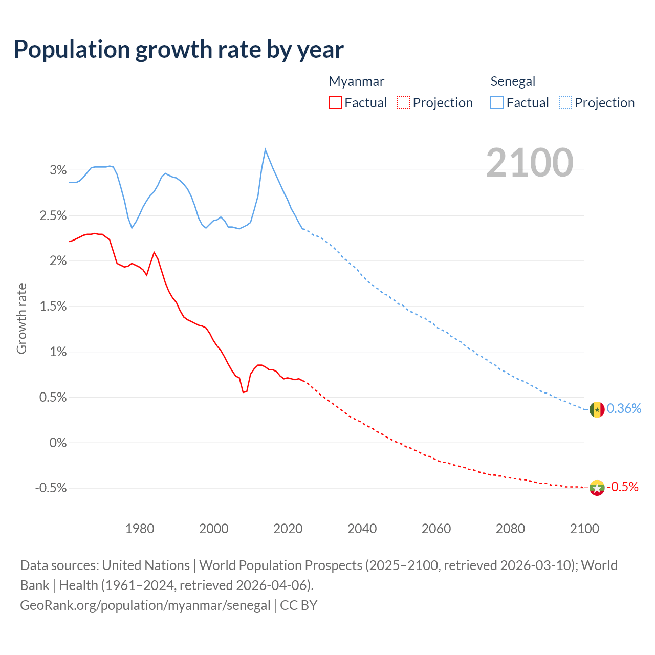 - For the last 10 years, Myanmar has had an average growth rate of +0.74% per year vs +2.76% in Senegal.