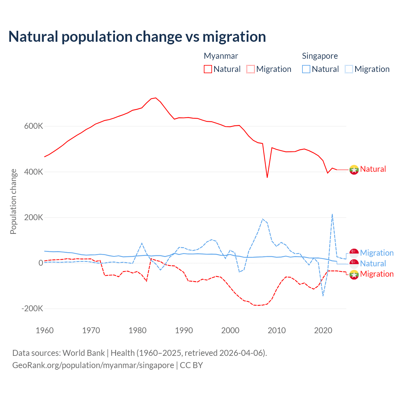 Over the last 10 years, 86% of the population change in Myanmar is from natural causes (a gain of 4,594,615 people) and 14% is from migration (a loss of 749,272 people). In Singapore 54.8% is from natural causes (a gain of 195,953 people) and 45.2% is from migration (a gain of 161,805 people).