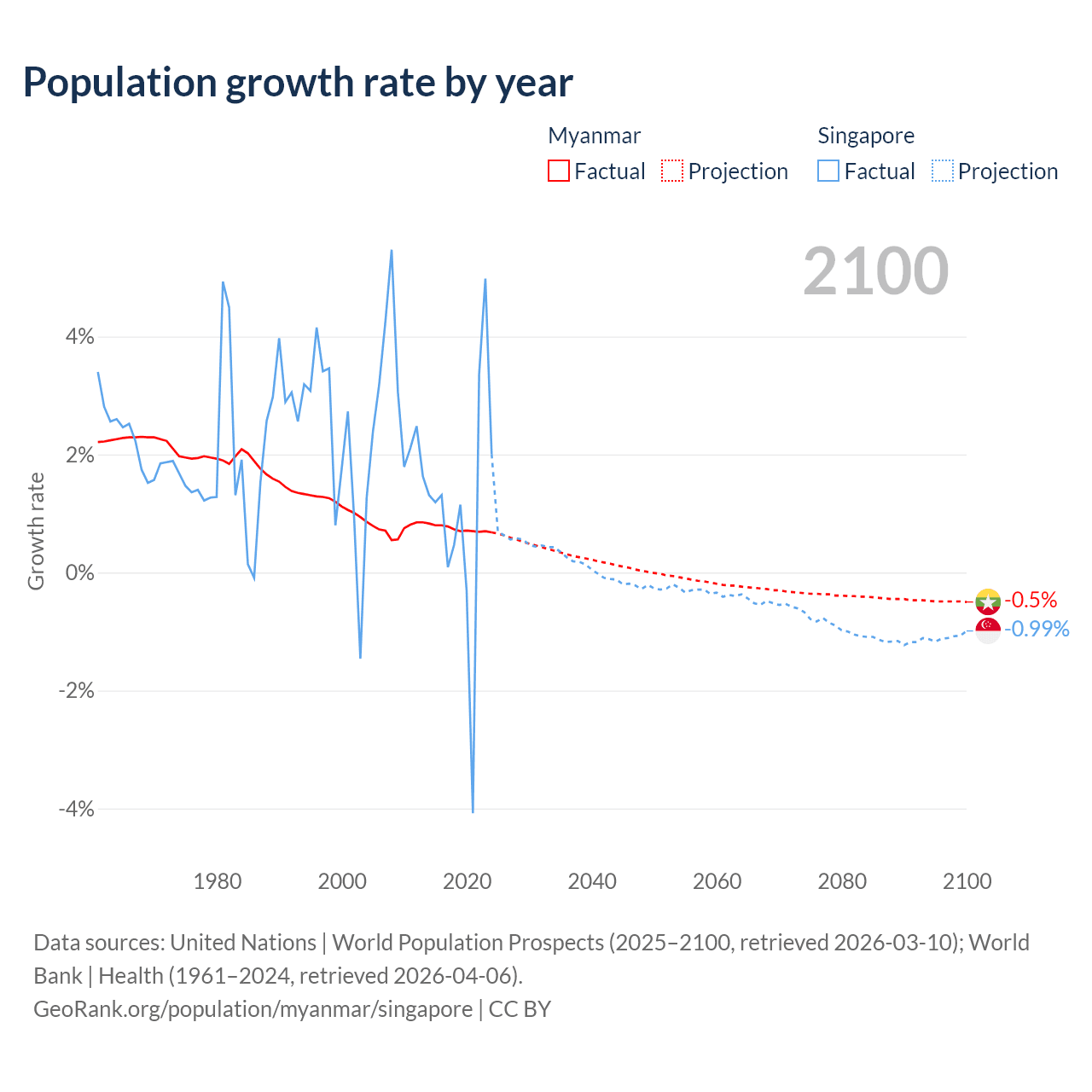 - For the last 10 years, Myanmar has had an average growth rate of +0.74% per year vs +1.04% in Singapore.