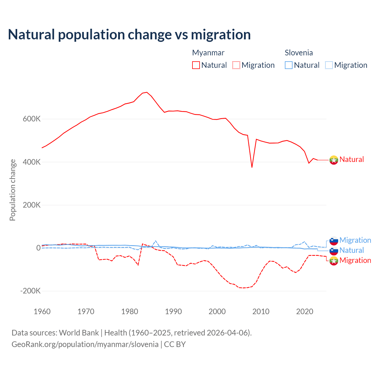 Over the last 10 years, 86% of the population change in Myanmar is from natural causes (a gain of 4,594,615 people) and 14% is from migration (a loss of 749,272 people). In Slovenia 18.1% is from natural causes (a loss of 17,573 people) and 81.9% is from migration (a gain of 79,532 people).