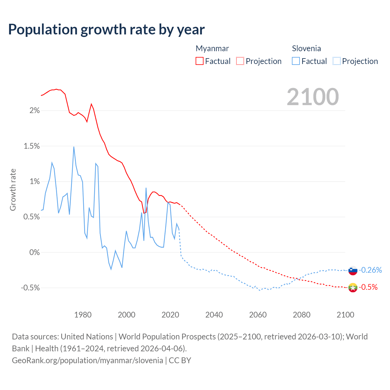 - For the last 10 years, Myanmar has had an average growth rate of +0.74% per year vs +0.29% in Slovenia.