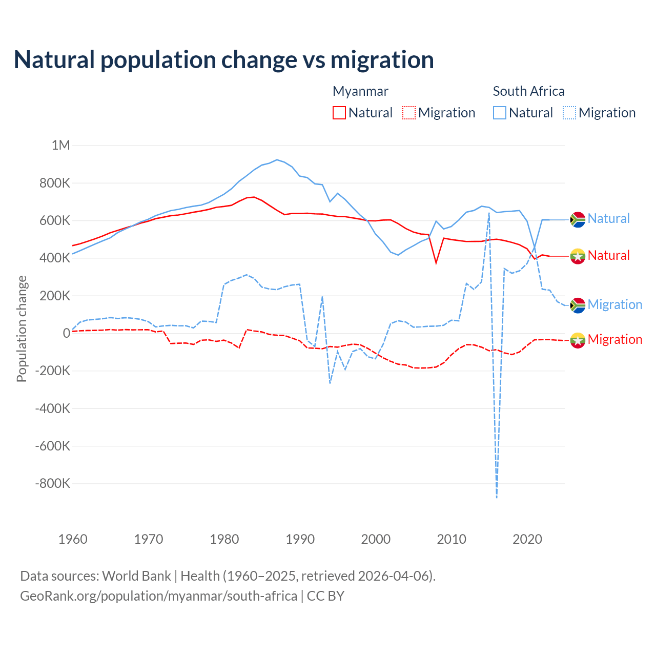 Over the last 10 years, 86% of the population change in Myanmar is from natural causes (a gain of 4,594,615 people) and 14% is from migration (a loss of 749,272 people). In South Africa 72.8% is from natural causes (a gain of 6,190,027 people) and 27.2% is from migration (a gain of 2,316,795 people).