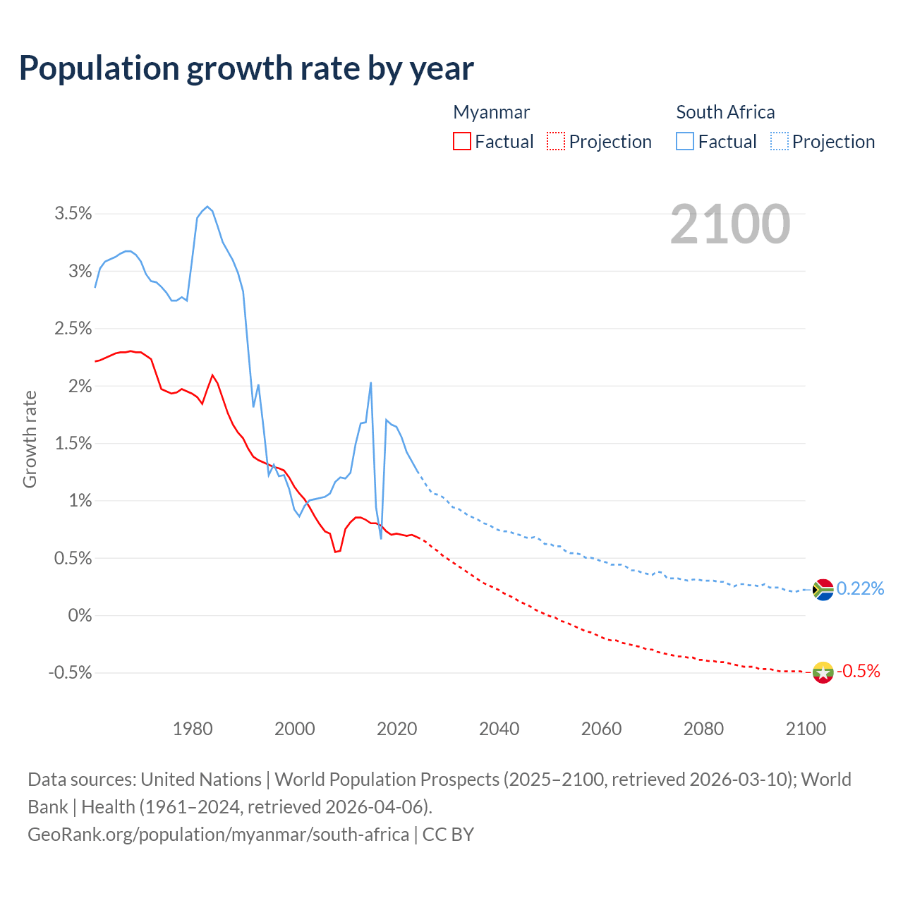 - For the last 10 years, Myanmar has had an average growth rate of +0.74% per year vs +1.44% in South Africa.