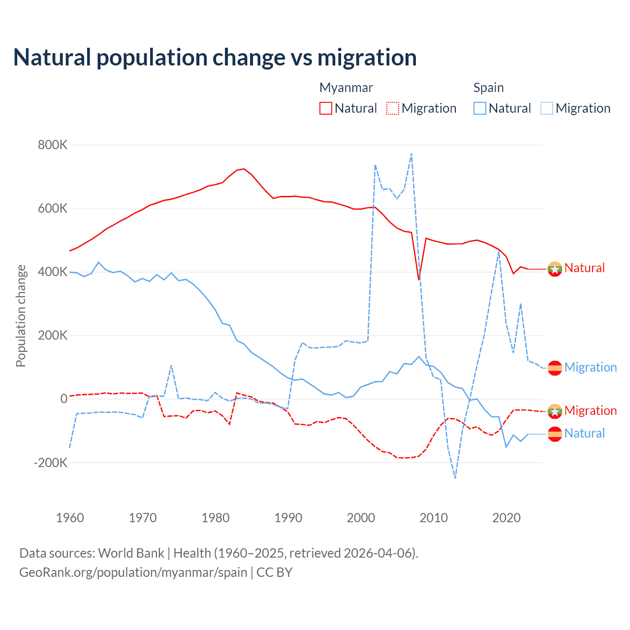 Over the last 10 years, 86% of the population change in Myanmar is from natural causes (a gain of 4,594,615 people) and 14% is from migration (a loss of 749,272 people). In Spain 25.8% is from natural causes (a loss of 627,829 people) and 74.2% is from migration (a gain of 1,810,127 people).