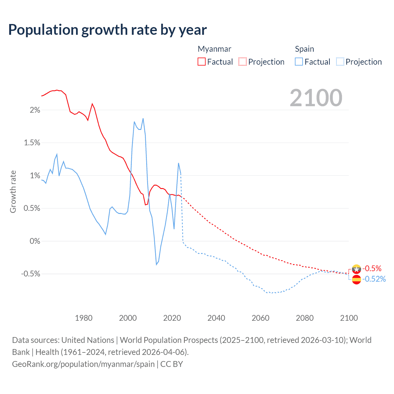 - For the last 10 years, Myanmar has had an average growth rate of +0.74% per year vs +0.43% in Spain.