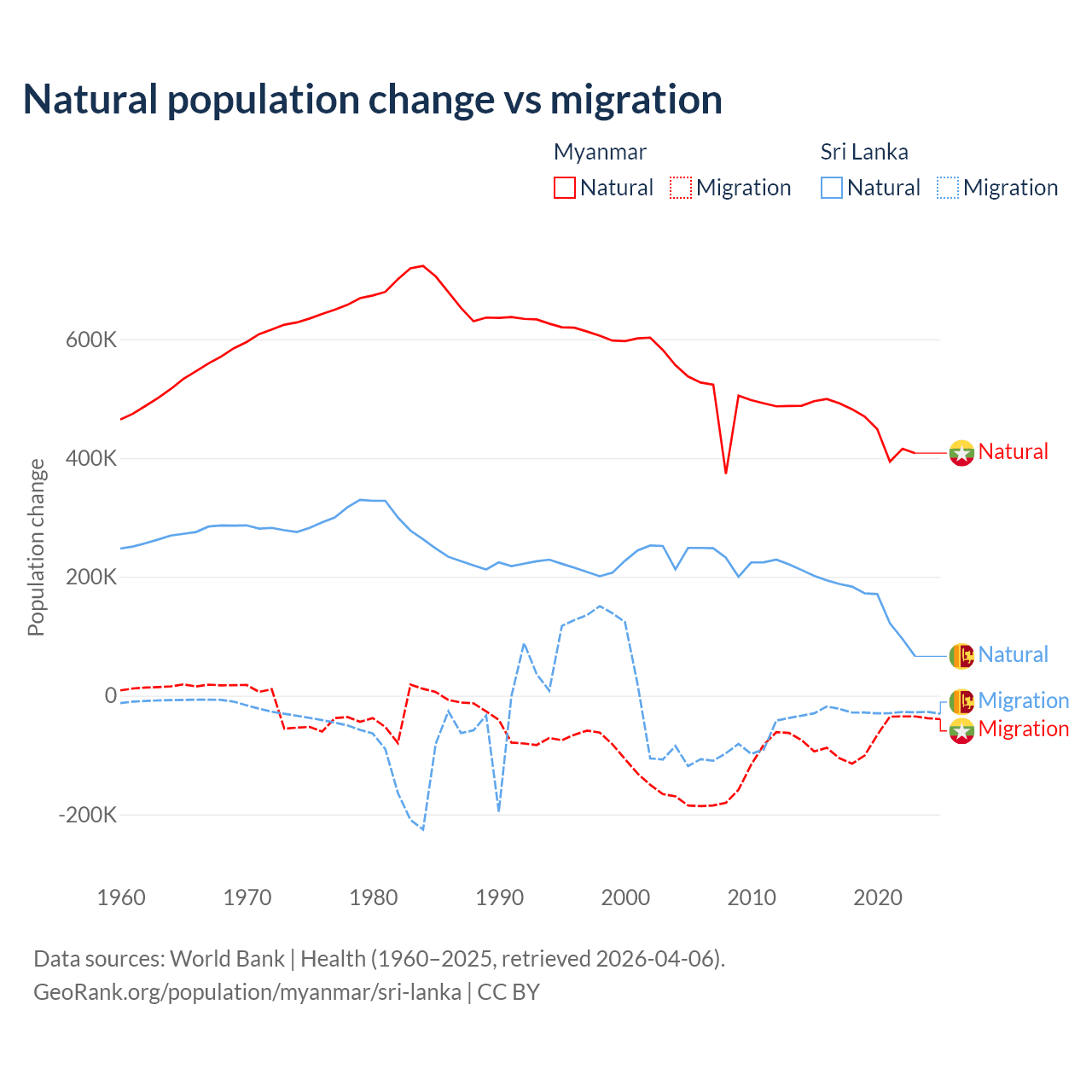 Over the last 10 years, 86% of the population change in Myanmar is from natural causes (a gain of 4,594,615 people) and 14% is from migration (a loss of 749,272 people). In Sri Lanka 85.3% is from natural causes (a gain of 1,605,749 people) and 14.7% is from migration (a loss of 276,121 people).