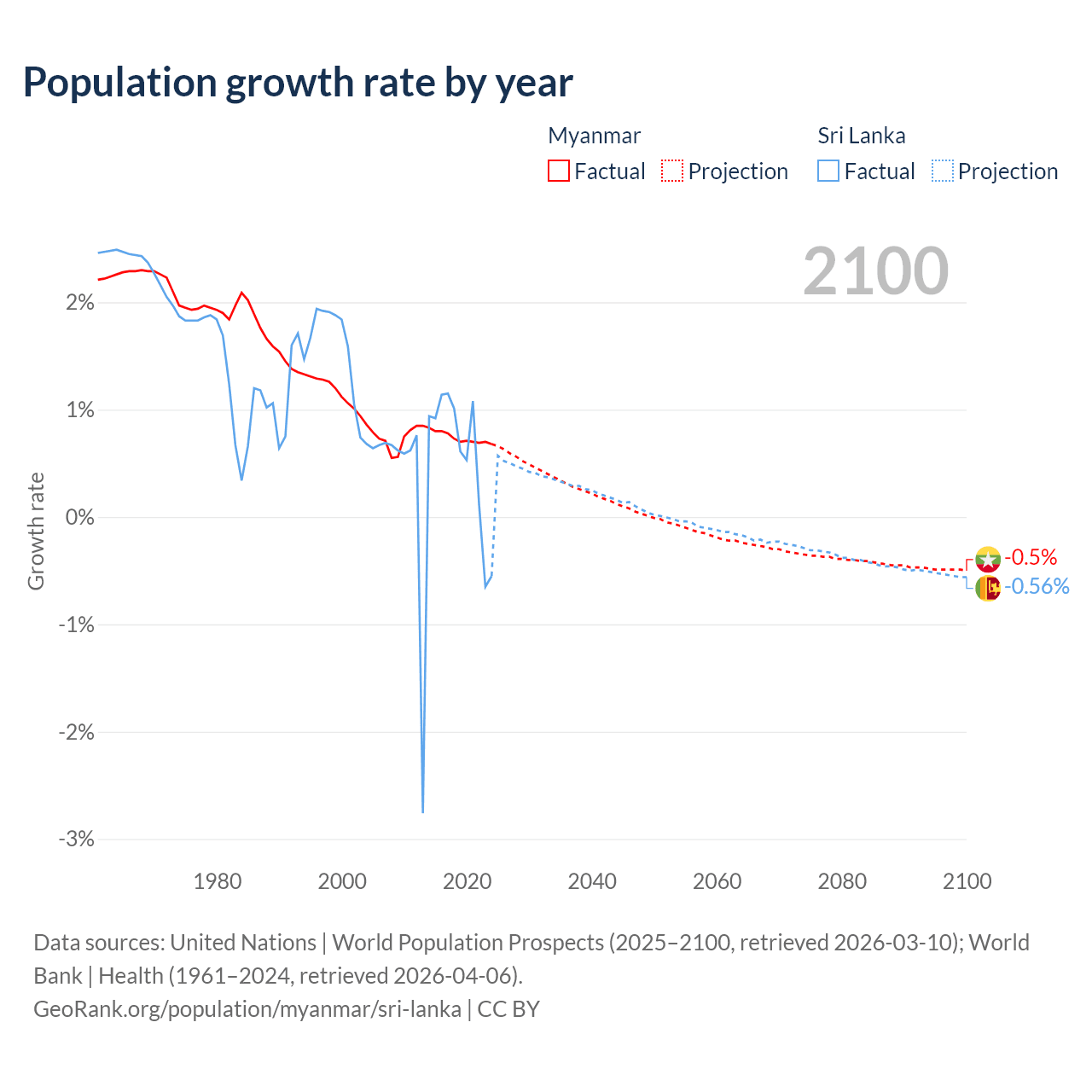 - For the last 10 years, Myanmar has had an average growth rate of +0.74% per year vs +0.57% in Sri Lanka.