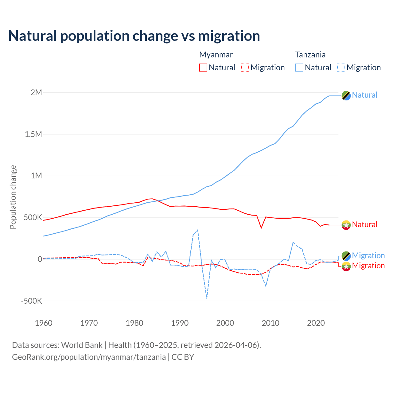 Over the last 10 years, 86% of the population change in Myanmar is from natural causes (a gain of 4,594,615 people) and 14% is from migration (a loss of 749,272 people). In Tanzania 98.7% is from natural causes (a gain of 17,769,541 people) and 1.27% is from migration (a gain of 229,466 people).