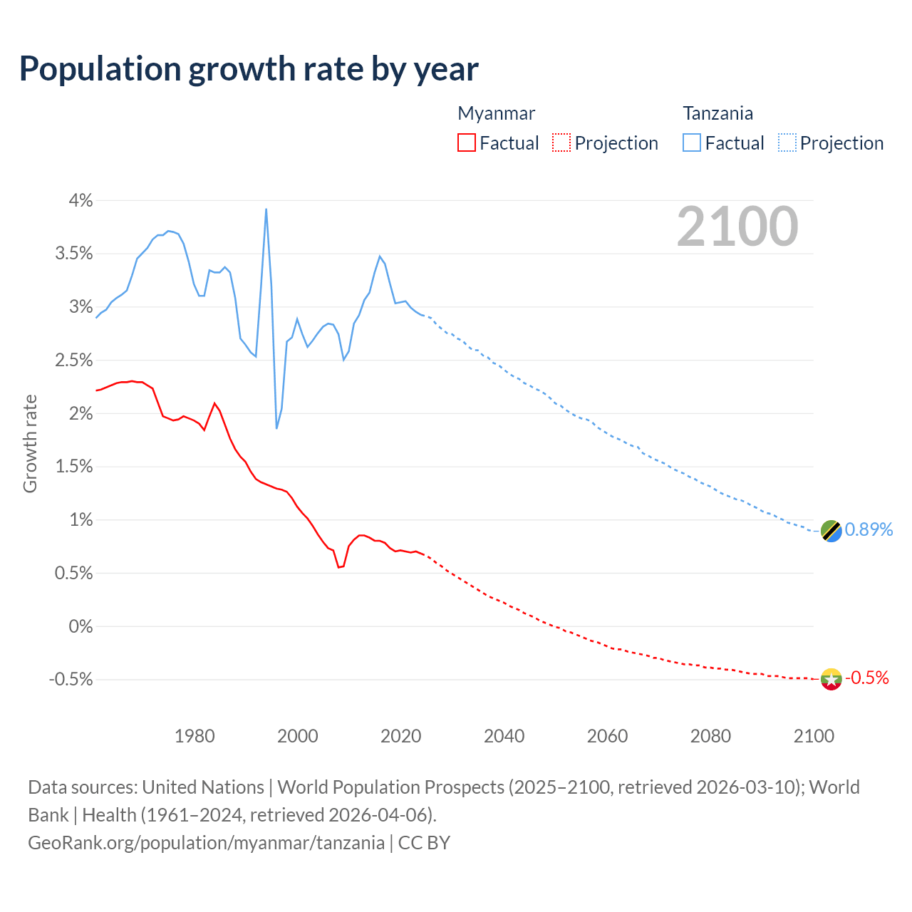 - For the last 10 years, Myanmar has had an average growth rate of +0.74% per year vs +3.13% in Tanzania.