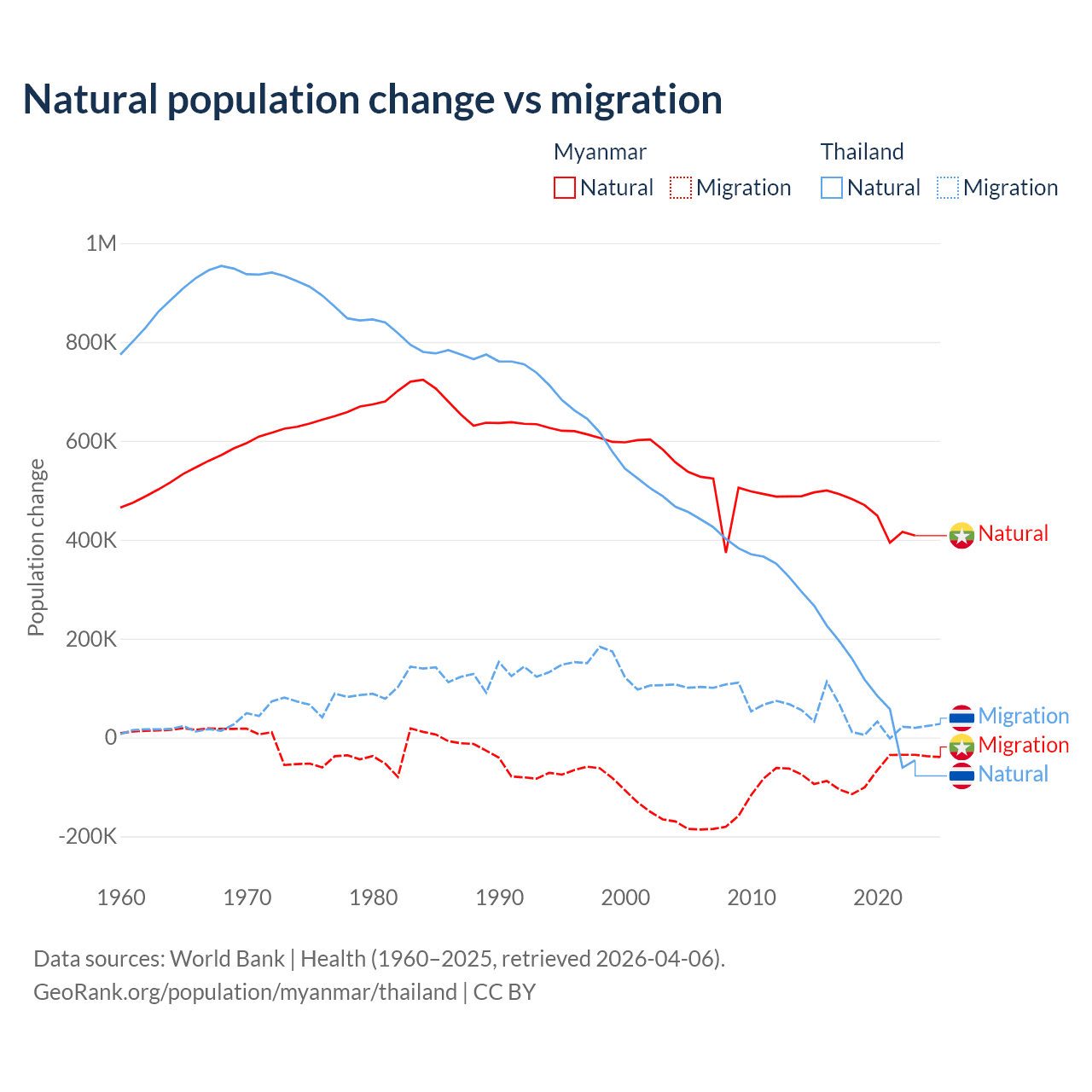 Over the last 10 years, 86% of the population change in Myanmar is from natural causes (a gain of 4,594,615 people) and 14% is from migration (a loss of 749,272 people). In Thailand 78.4% is from natural causes (a gain of 1,292,528 people) and 21.6% is from migration (a gain of 355,361 people).