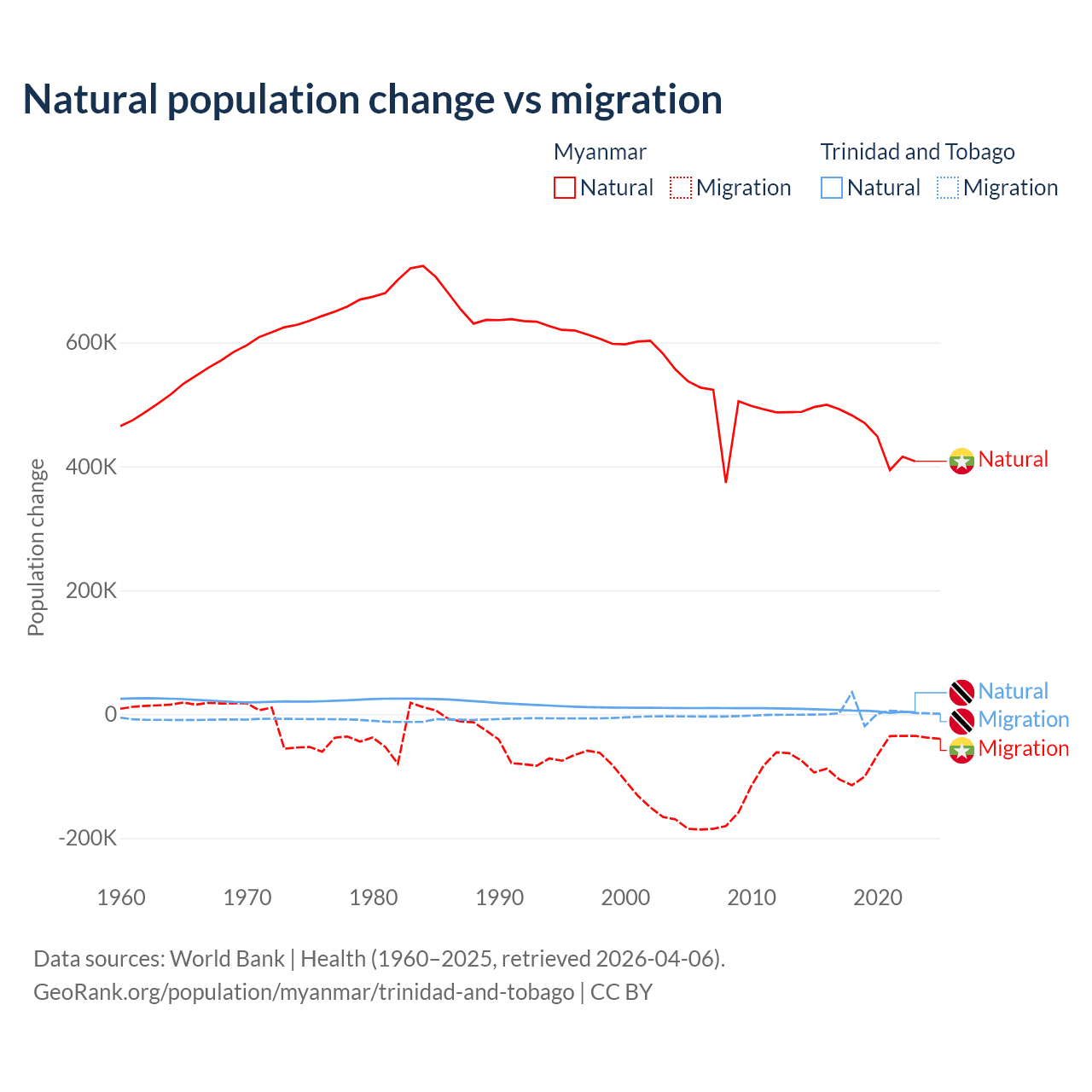 Over the last 10 years, 86% of the population change in Myanmar is from natural causes (a gain of 4,594,615 people) and 14% is from migration (a loss of 749,272 people). In Trinidad and Tobago 66% is from natural causes (a gain of 55,887 people) and 34% is from migration (a gain of 28,785 people).