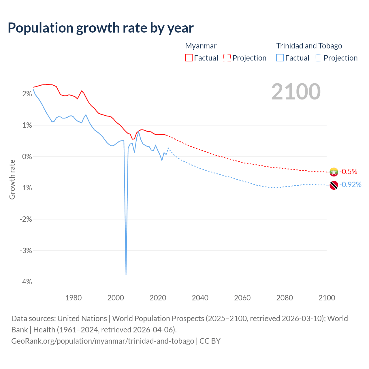 - For the last 10 years, Myanmar has had an average growth rate of +0.74% per year vs +0.19% in Trinidad and Tobago.