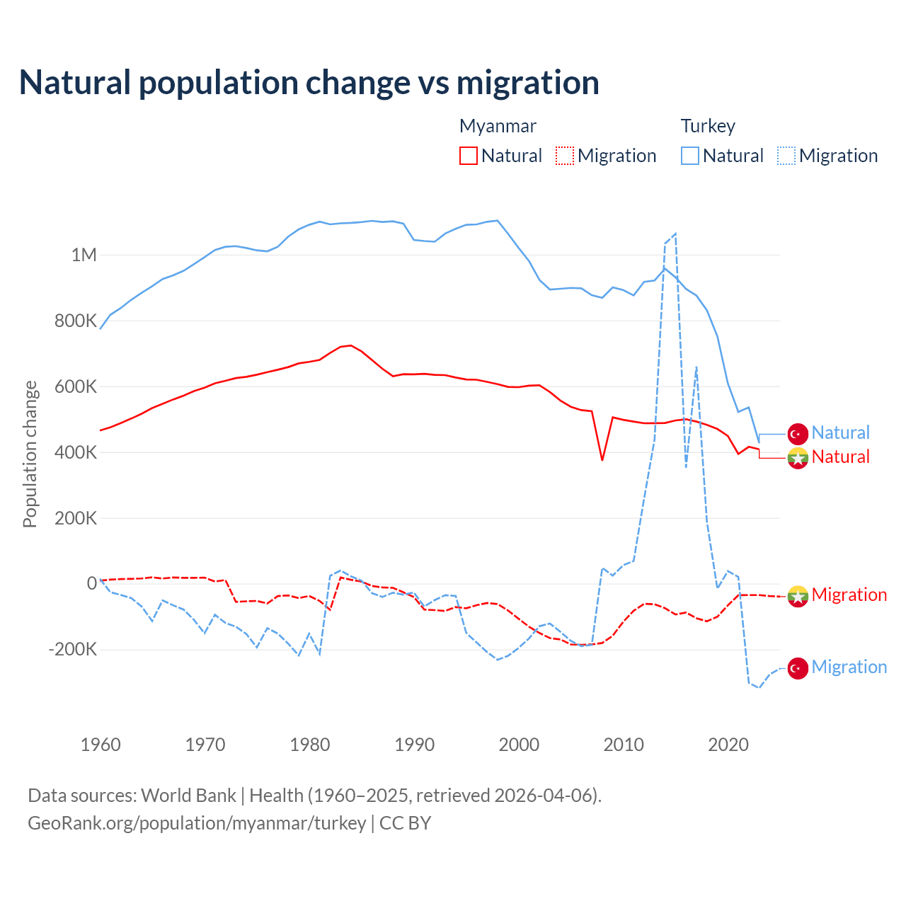 Over the last 10 years, 86% of the population change in Myanmar is from natural causes (a gain of 4,594,615 people) and 14% is from migration (a loss of 749,272 people). In Turkey 73% is from natural causes (a gain of 7,333,352 people) and 27% is from migration (a gain of 2,718,916 people).