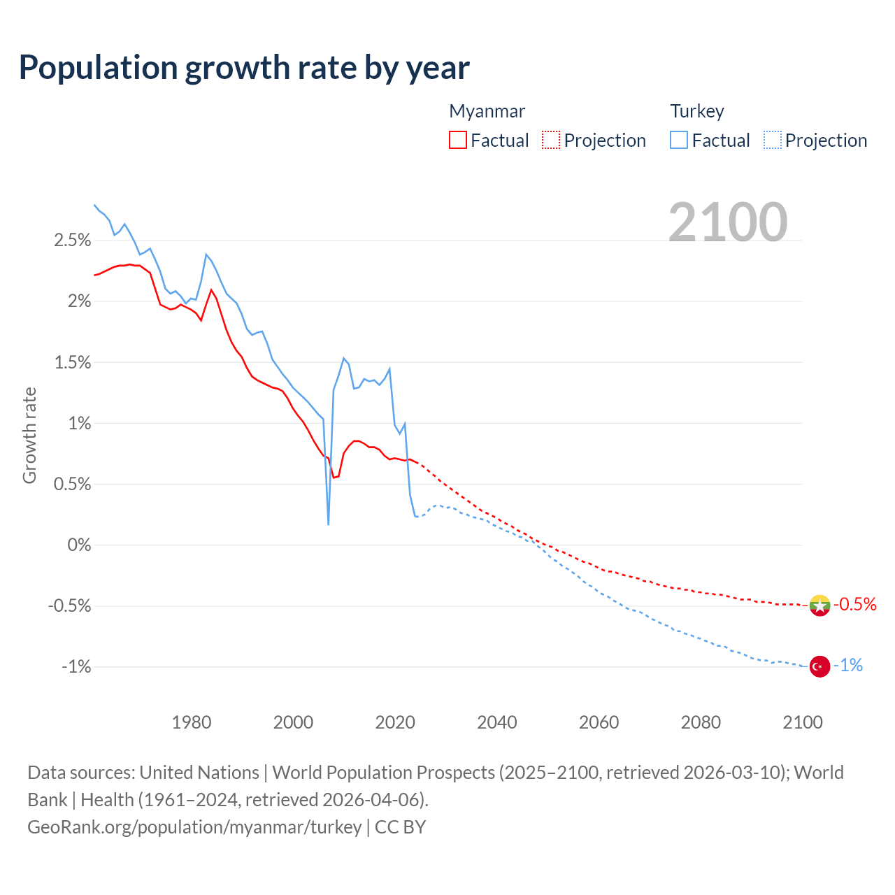 - For the last 10 years, Myanmar has had an average growth rate of +0.74% per year vs +1.06% in Turkey.