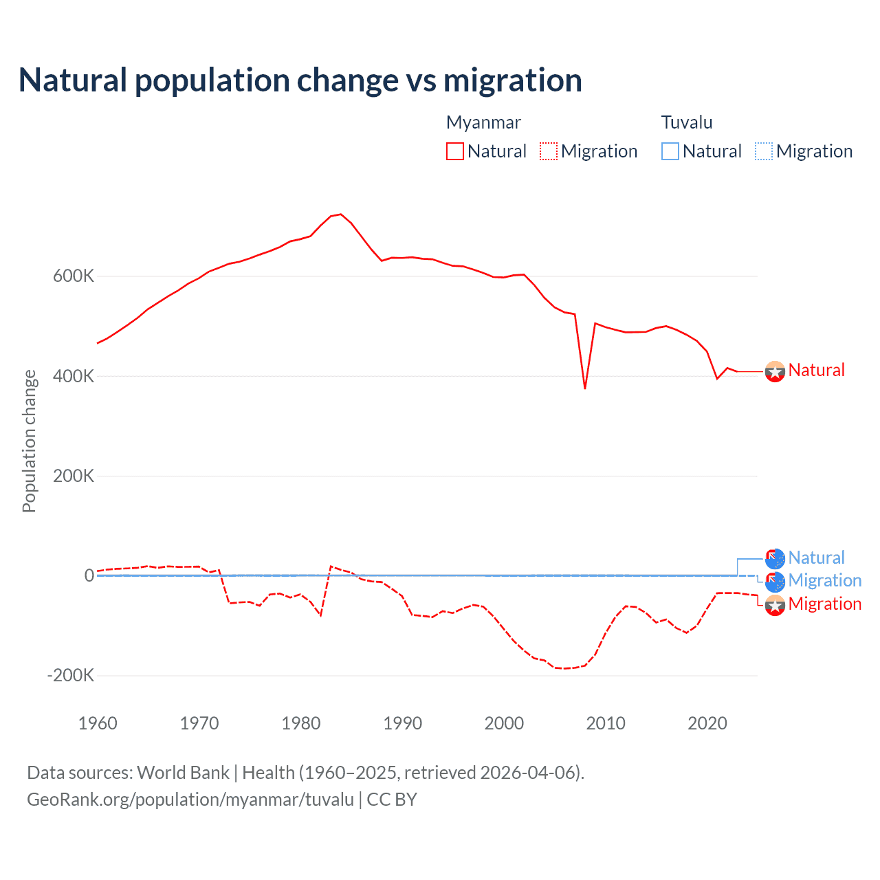 Over the last 10 years, 86% of the population change in Myanmar is from natural causes (a gain of 4,594,615 people) and 14% is from migration (a loss of 749,272 people). In Tuvalu 35.5% is from natural causes (a gain of 1,556 people) and 64.5% is from migration (a loss of 2,827 people).
