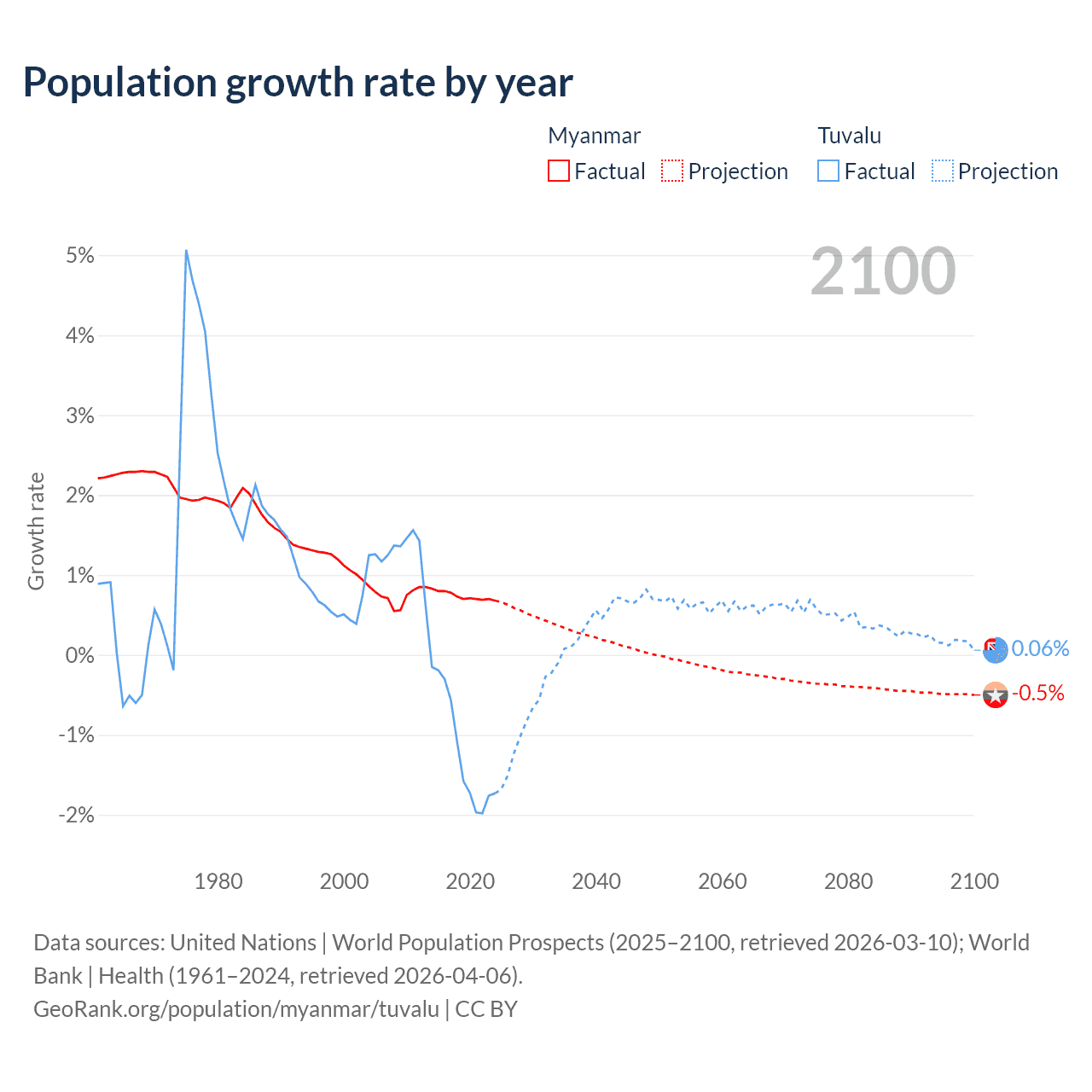 - For the last 10 years, Myanmar has had an average growth rate of +0.74% per year vs -1.19% in Tuvalu.
