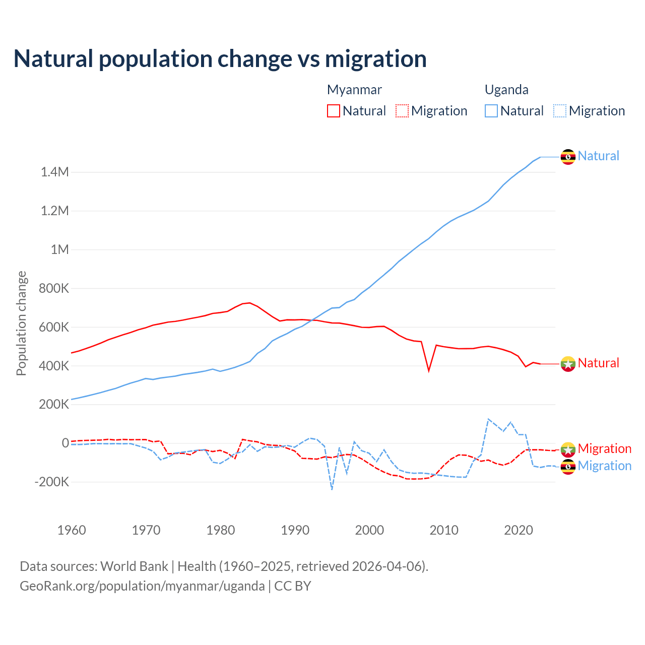 Over the last 10 years, 86% of the population change in Myanmar is from natural causes (a gain of 4,594,615 people) and 14% is from migration (a loss of 749,272 people). In Uganda 99.5% is from natural causes (a gain of 13,419,712 people) and 0.53% is from migration (a gain of 71,457 people).
