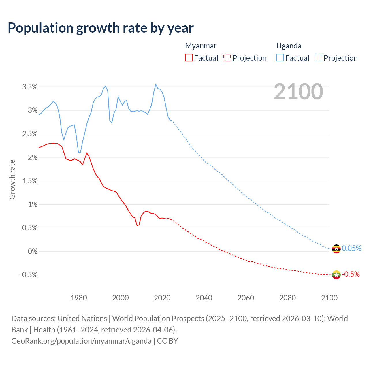- For the last 10 years, Myanmar has had an average growth rate of +0.74% per year vs +3.21% in Uganda.