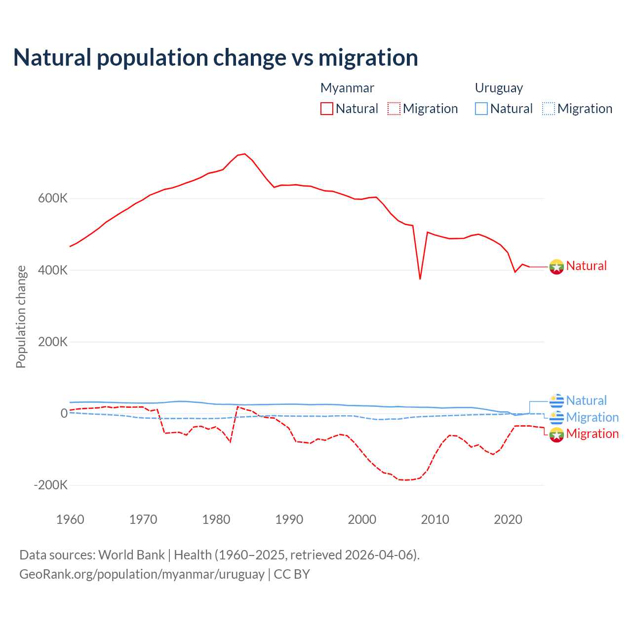 Over the last 10 years, 86% of the population change in Myanmar is from natural causes (a gain of 4,594,615 people) and 14% is from migration (a loss of 749,272 people). In Uruguay 70% is from natural causes (a gain of 64,303 people) and 30% is from migration (a loss of 27,501 people).