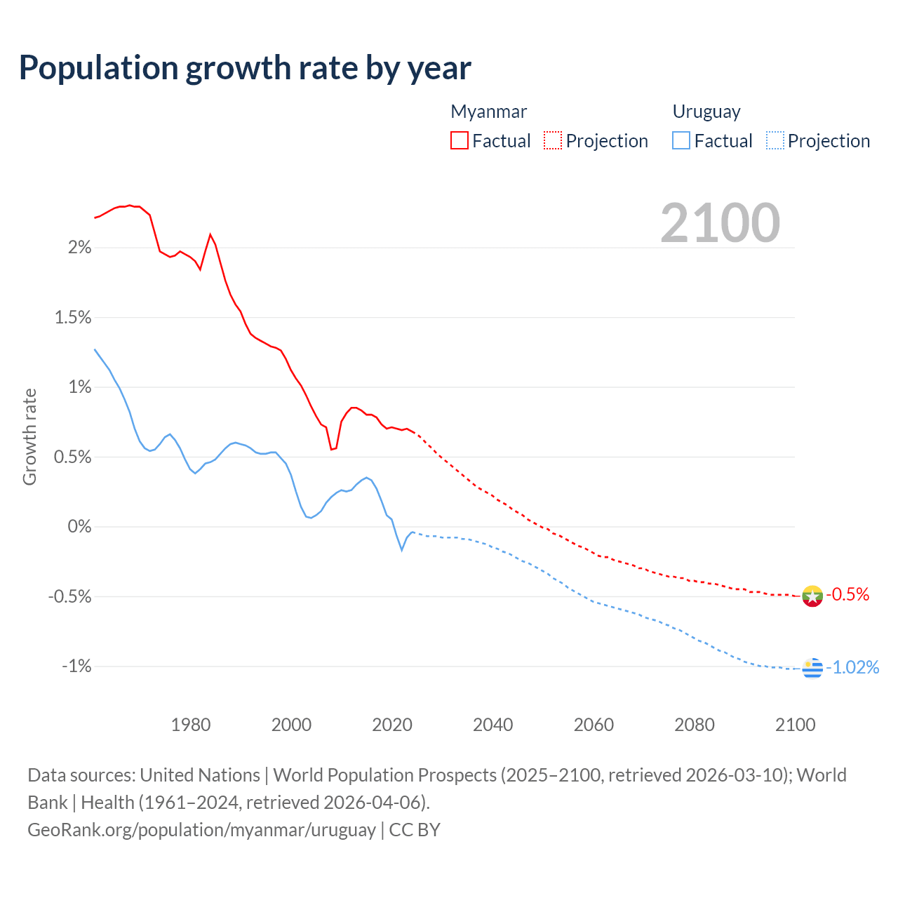 - For the last 10 years, Myanmar has had an average growth rate of +0.74% per year vs +0.11% in Uruguay.