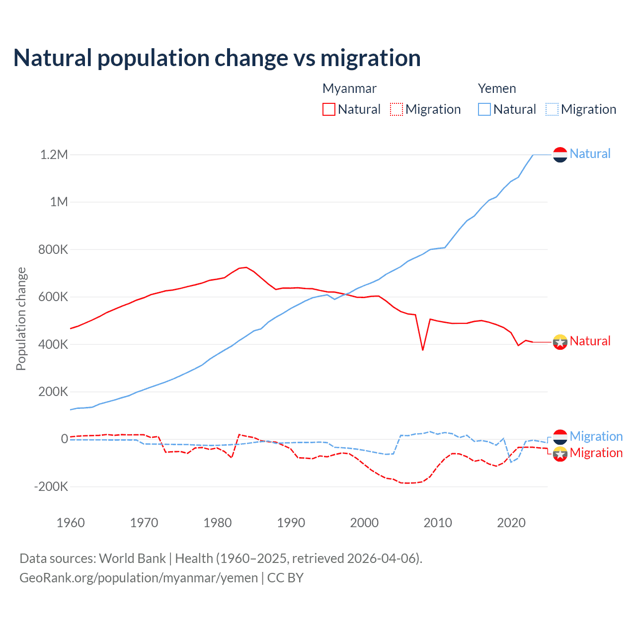 Over the last 10 years, 86% of the population change in Myanmar is from natural causes (a gain of 4,594,615 people) and 14% is from migration (a loss of 749,272 people). In Yemen 97.8% is from natural causes (a gain of 10,460,813 people) and 2.17% is from migration (a loss of 231,814 people).