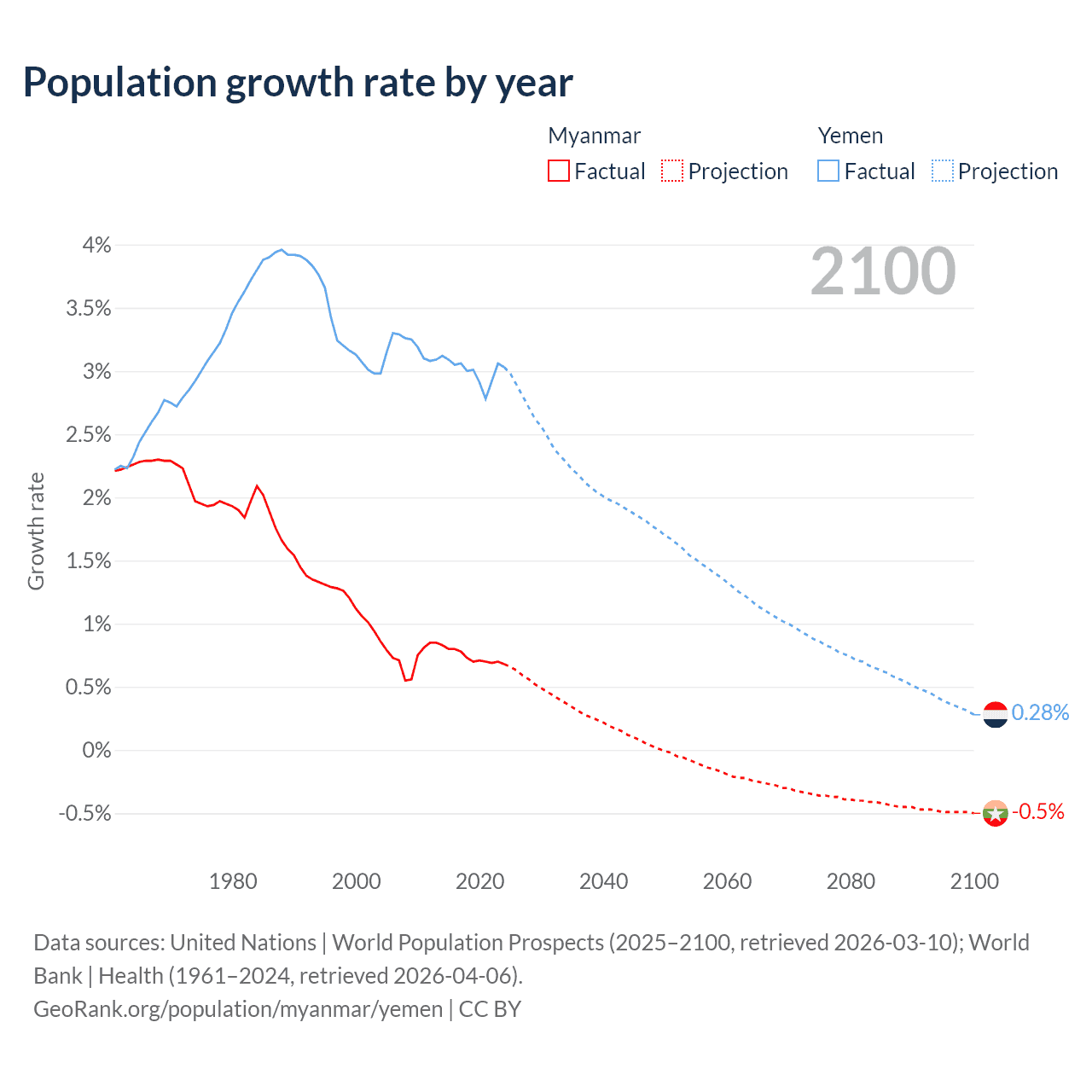- For the last 10 years, Myanmar has had an average growth rate of +0.74% per year vs +3% in Yemen.