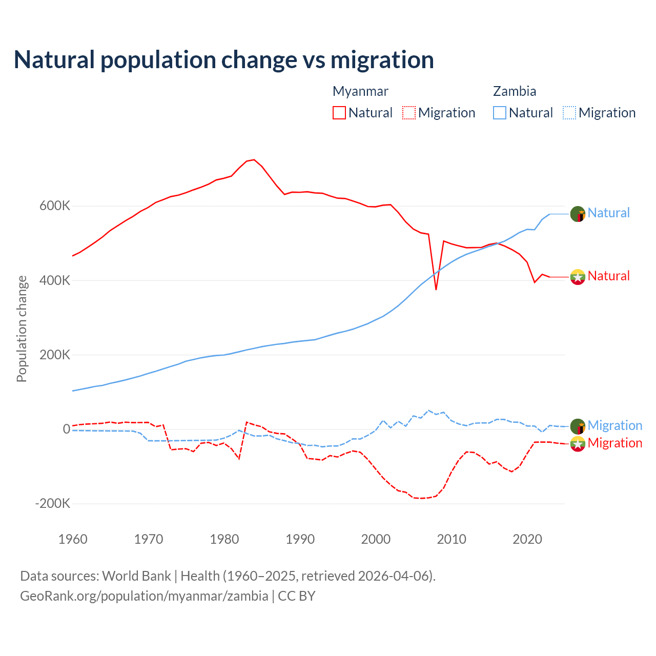 Over the last 10 years, 86% of the population change in Myanmar is from natural causes (a gain of 4,594,615 people) and 14% is from migration (a loss of 749,272 people). In Zambia 97.4% is from natural causes (a gain of 5,233,797 people) and 2.58% is from migration (a gain of 138,554 people).