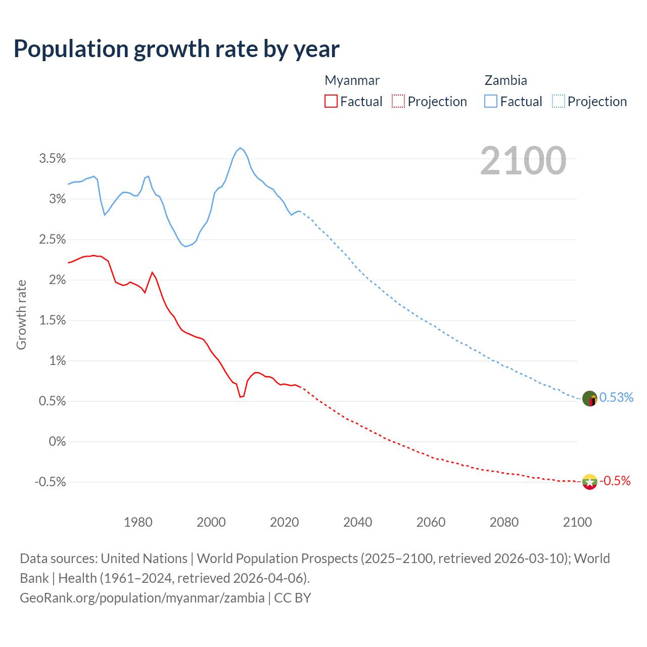- For the last 10 years, Myanmar has had an average growth rate of +0.74% per year vs +3% in Zambia.