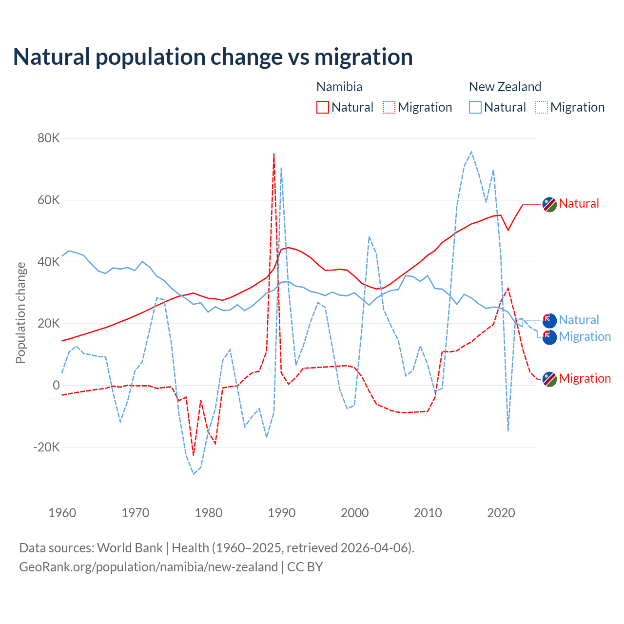 Over the last 10 years, 74.3% of the population change in Namibia is from natural causes (a gain of 532,532 people) and 25.7% is from migration (a gain of 183,837 people). In New Zealand 34.4% is from natural causes (a gain of 247,767 people) and 65.6% is from migration (a gain of 471,602 people).