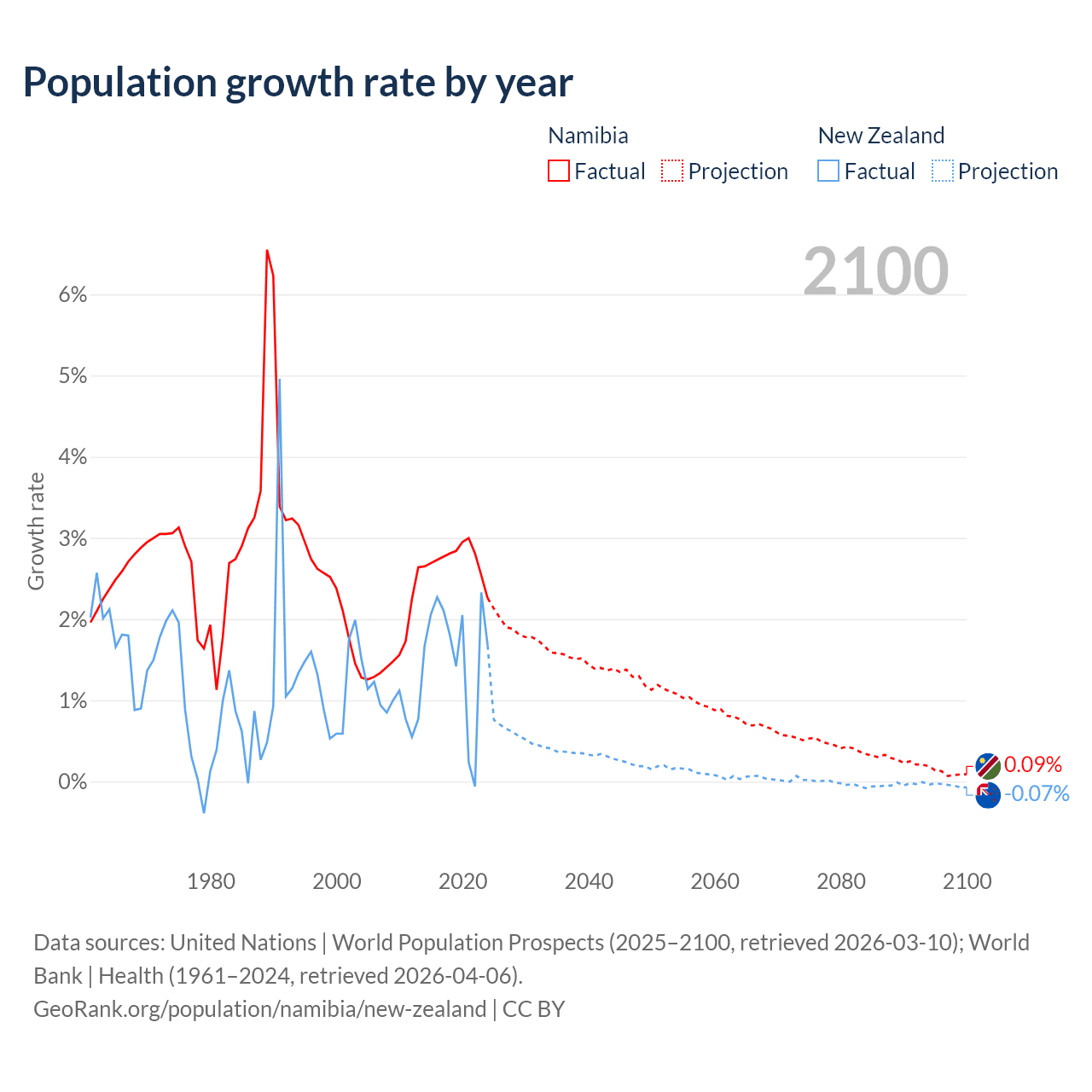 - For the last 10 years, Namibia has had an average growth rate of +2.73% per year vs +1.6% in New Zealand.