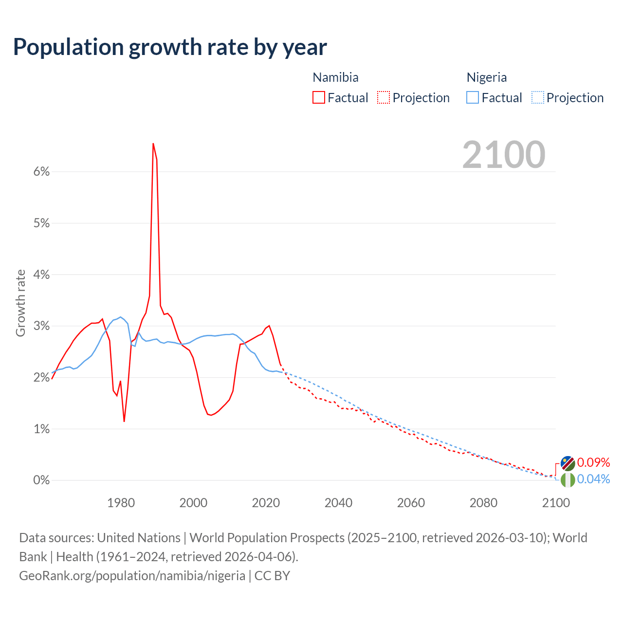 Data sources: World Bank | Health (1960–2024, retrieved 2026-04-06); United Nations | World Population Prospects (1960–2026, retrieved 2026-03-10); U.S. Census Bureau (1960–2025, retrieved 2026-02-08); Central Intelligence Agency (CIA) (2000–2019, retrieved 2026-02-20).