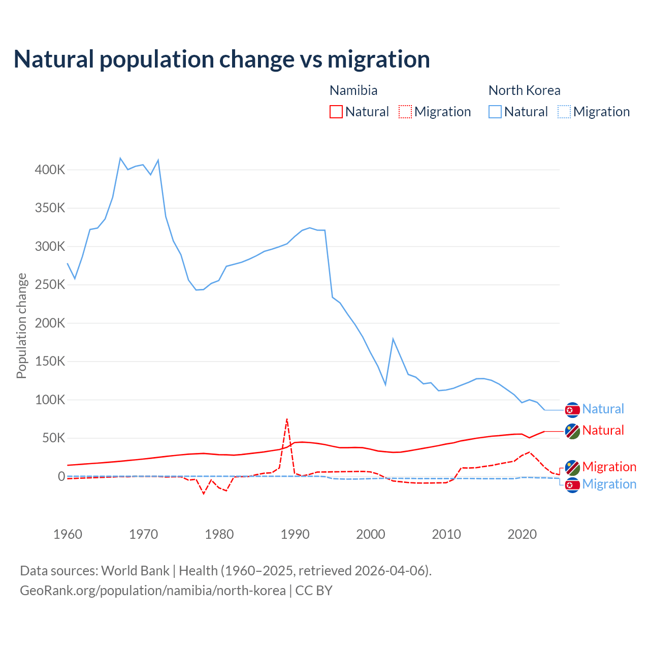 Over the last 10 years, 74.3% of the population change in Namibia is from natural causes (a gain of 532,532 people) and 25.7% is from migration (a gain of 183,837 people). In North Korea 97.7% is from natural causes (a gain of 1,097,372 people) and 2.33% is from migration (a loss of 26,227 people).