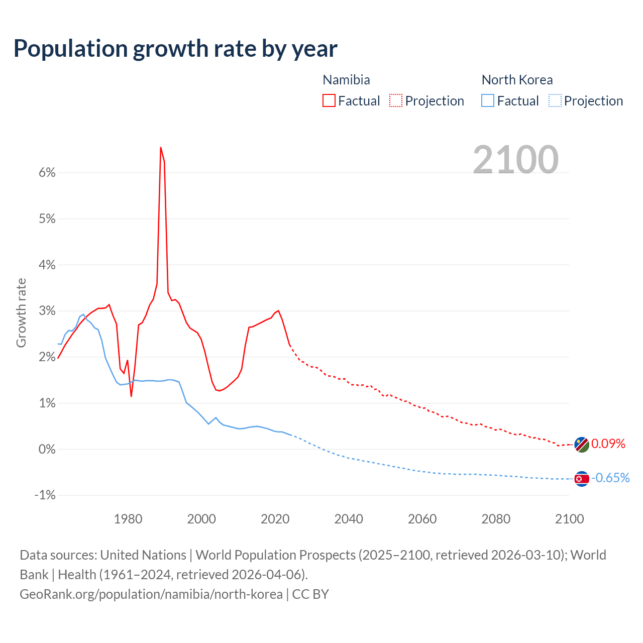 - For the last 10 years, Namibia has had an average growth rate of +2.73% per year vs +0.41% in North Korea.