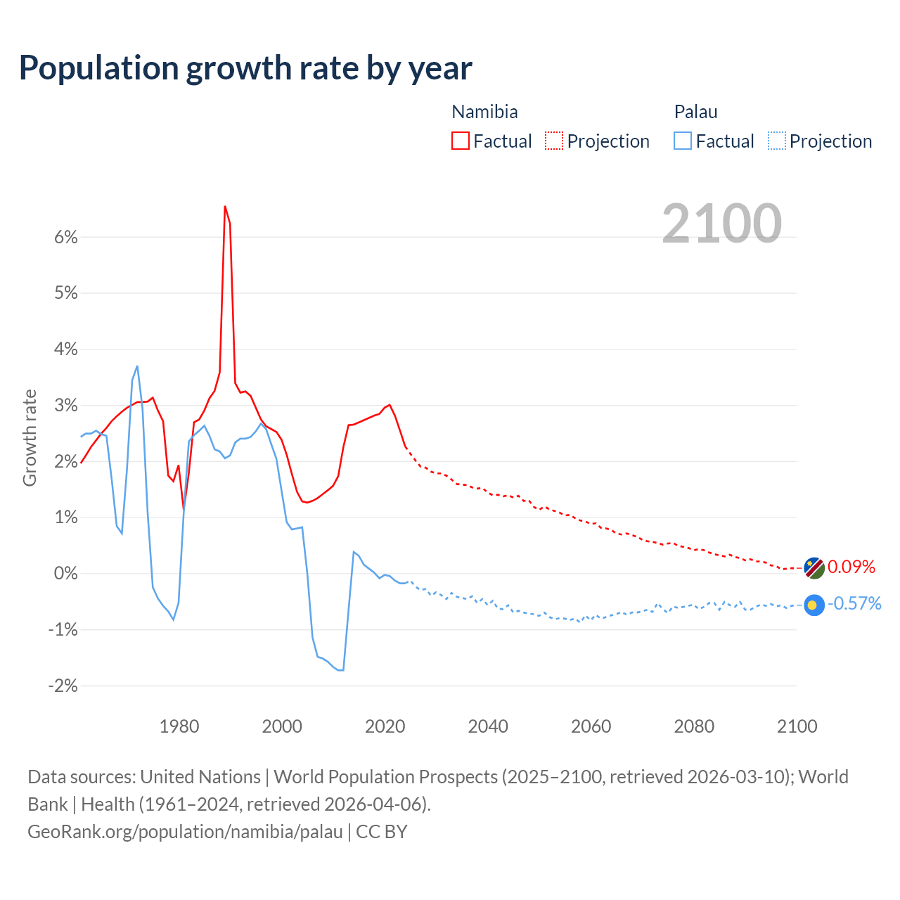 - For the last 10 years, Namibia has had an average growth rate of +2.73% per year vs +0.02% in Palau.