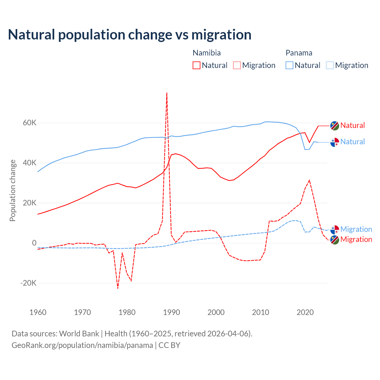 Over the last 10 years, 74.3% of the population change in Namibia is from natural causes (a gain of 532,532 people) and 25.7% is from migration (a gain of 183,837 people). In Panama 86.5% is from natural causes (a gain of 544,211 people) and 13.5% is from migration (a gain of 84,849 people).