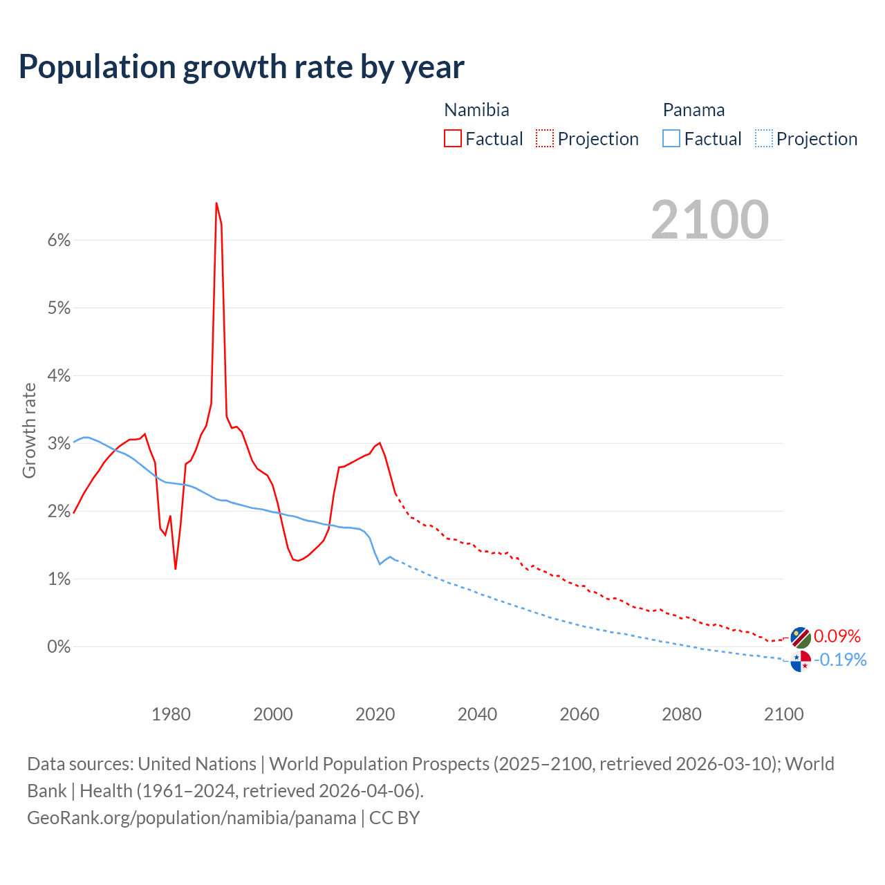 - For the last 10 years, Namibia has had an average growth rate of +2.73% per year vs +1.52% in Panama.