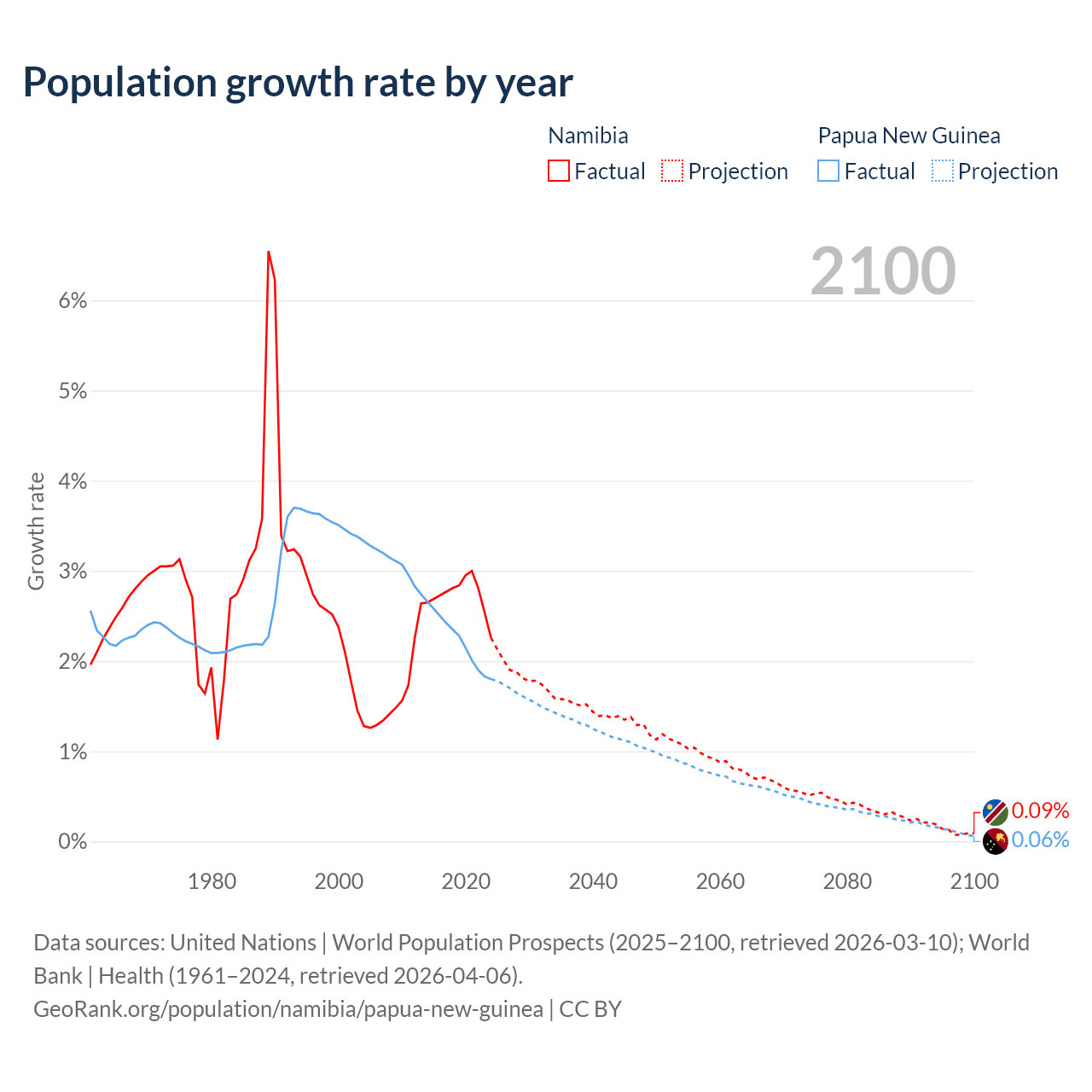 - For the last 10 years, Namibia has had an average growth rate of +2.73% per year vs +2.23% in Papua New Guinea.