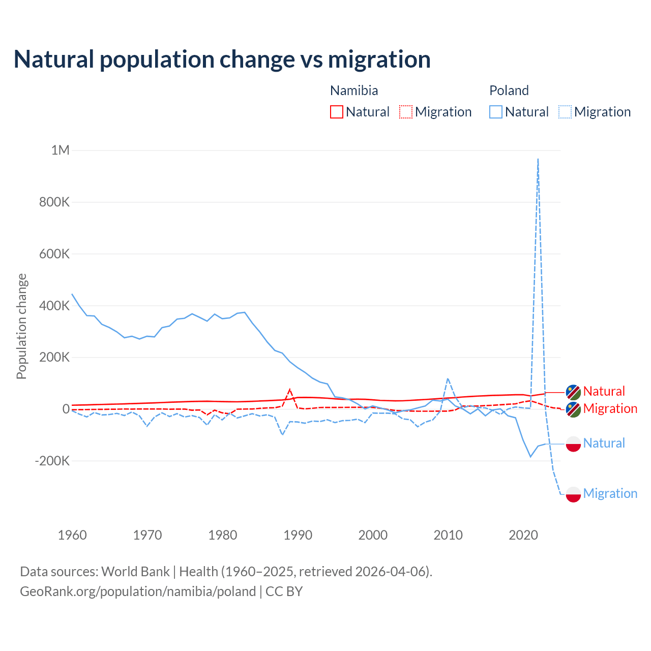 Over the last 10 years, 74.3% of the population change in Namibia is from natural causes (a gain of 532,532 people) and 25.7% is from migration (a gain of 183,837 people). In Poland 41.4% is from natural causes (a loss of 675,443 people) and 58.6% is from migration (a gain of 955,766 people).