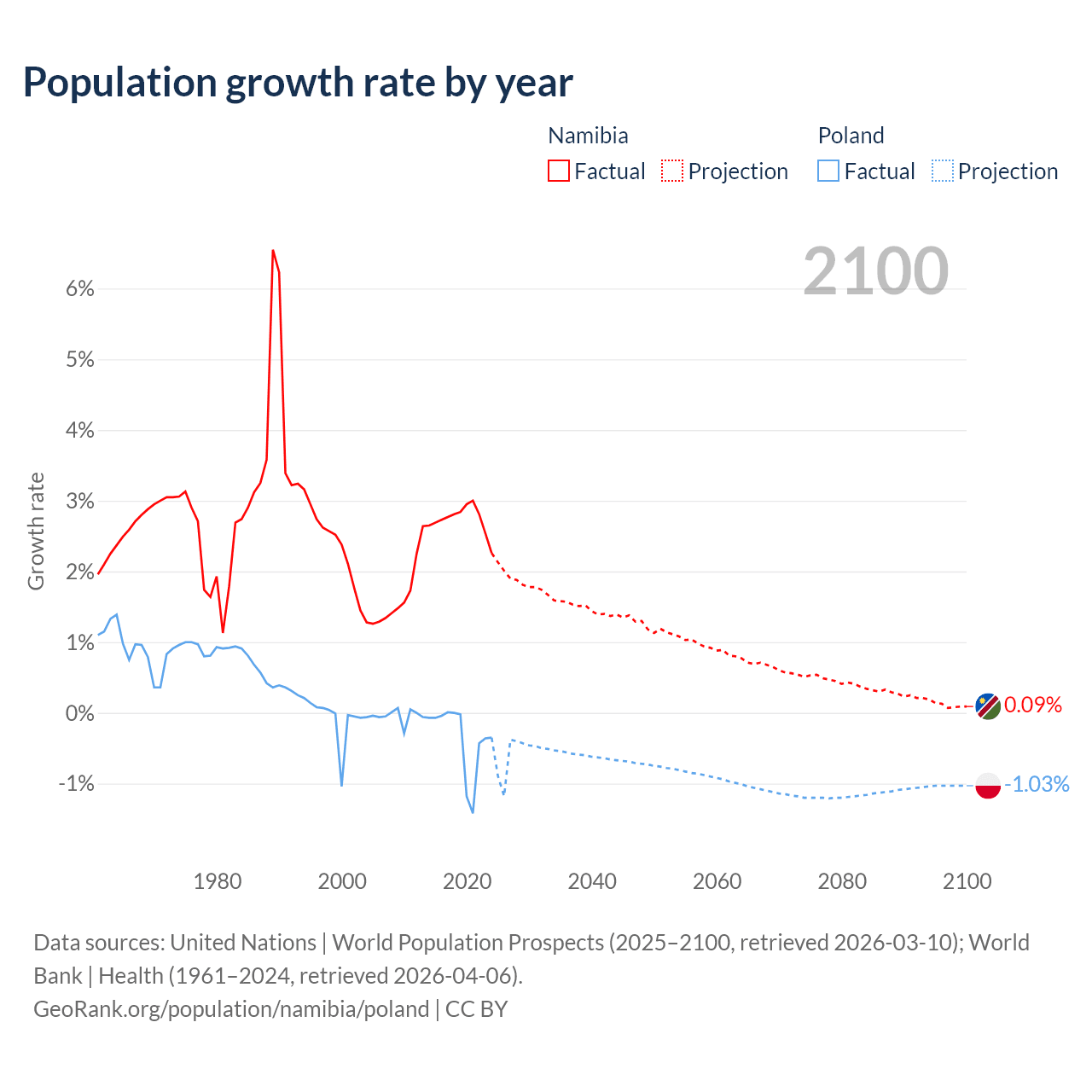 - For the last 10 years, Namibia has had an average growth rate of +2.73% per year vs -0.36% in Poland.