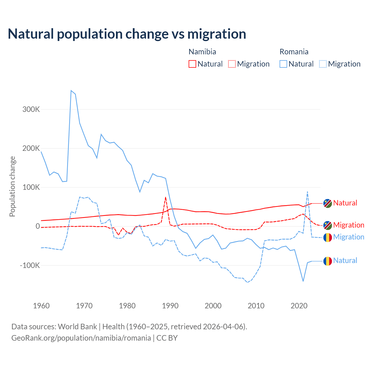 Over the last 10 years, 74.3% of the population change in Namibia is from natural causes (a gain of 532,532 people) and 25.7% is from migration (a gain of 183,837 people). In Romania 82% is from natural causes (a loss of 766,295 people) and 18% is from migration (a loss of 167,917 people).