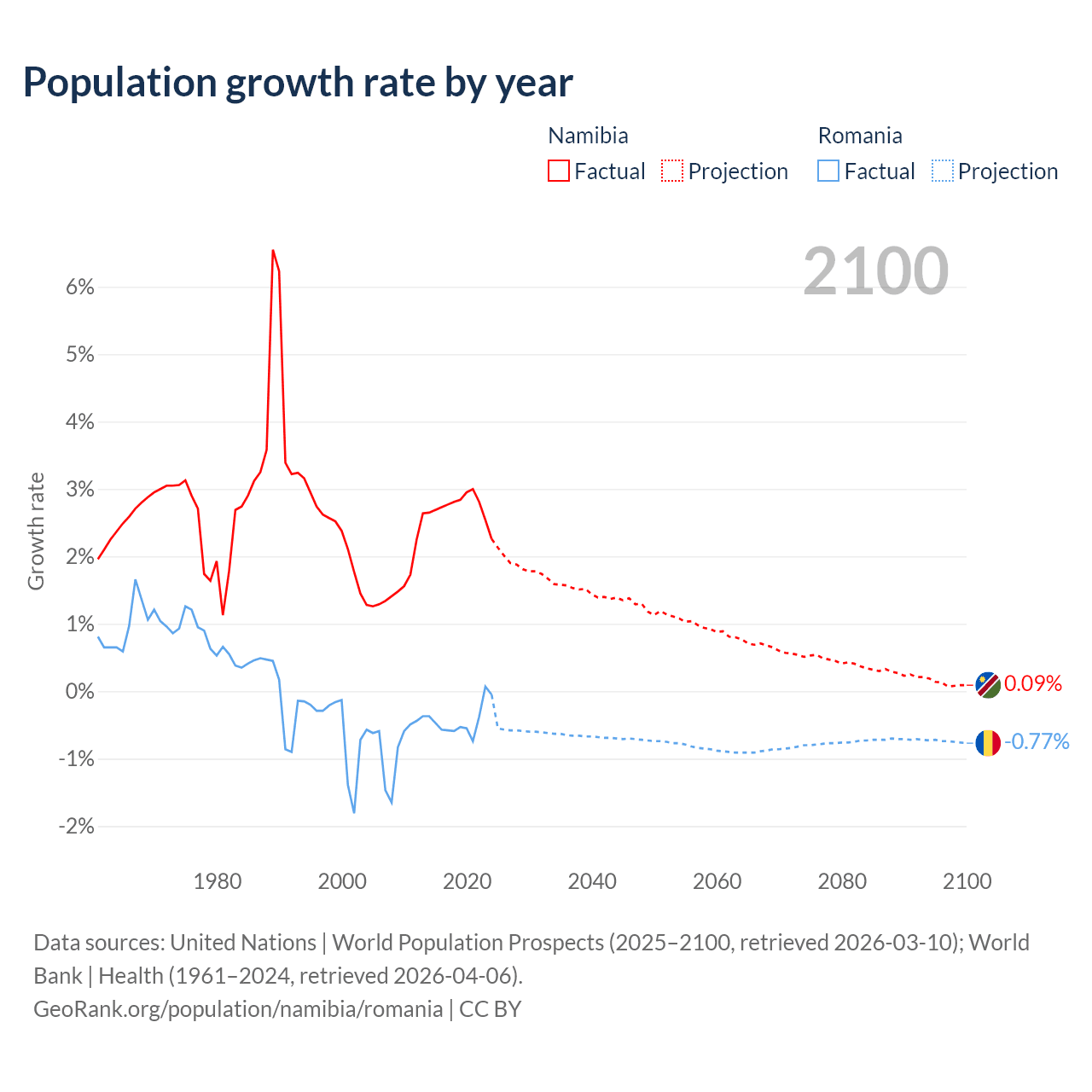 - For the last 10 years, Namibia has had an average growth rate of +2.73% per year vs -0.43% in Romania.