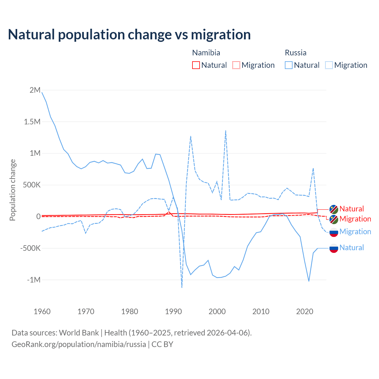 Over the last 10 years, 74.3% of the population change in Namibia is from natural causes (a gain of 532,532 people) and 25.7% is from migration (a gain of 183,837 people). In Russia 48.6% is from natural causes (a loss of 3,416,377 people) and 51.4% is from migration (a gain of 3,611,826 people).