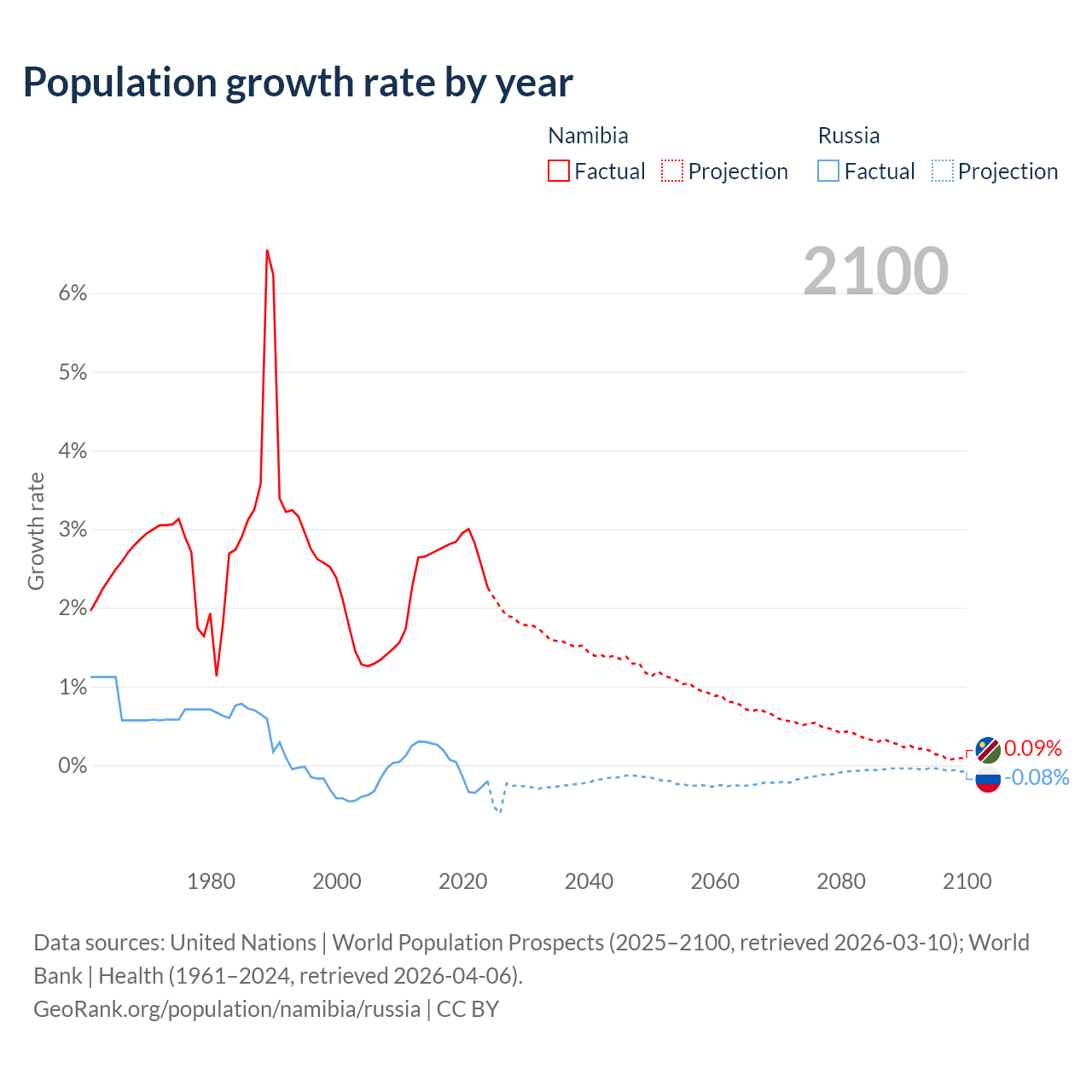 - For the last 10 years, Namibia has had an average growth rate of +2.73% per year vs -0.02% in Russia.