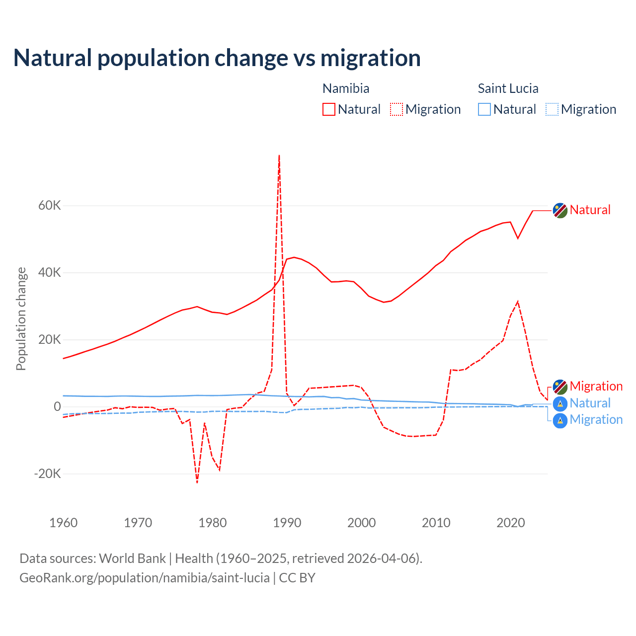 Over the last 10 years, 74.3% of the population change in Namibia is from natural causes (a gain of 532,532 people) and 25.7% is from migration (a gain of 183,837 people). In Saint Lucia 95.7% is from natural causes (a gain of 6,039 people) and 4.31% is from migration (a loss of 272 people).